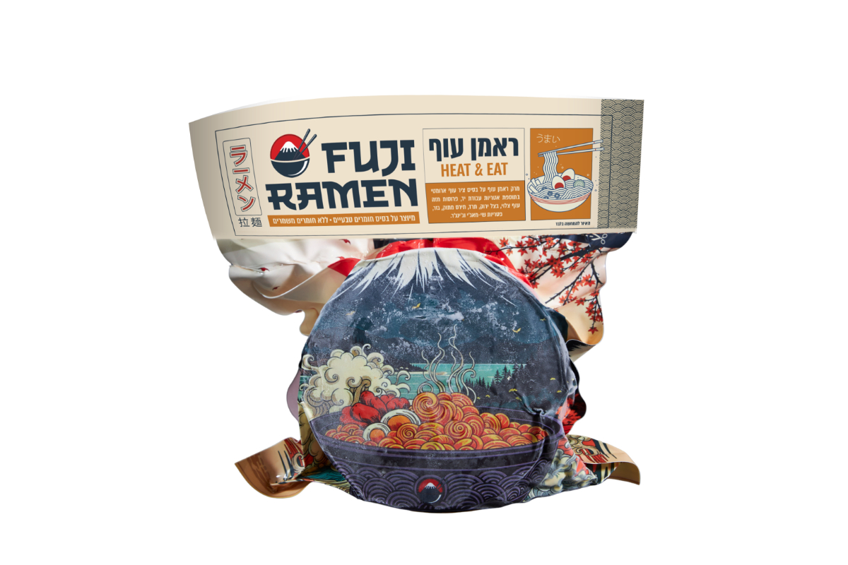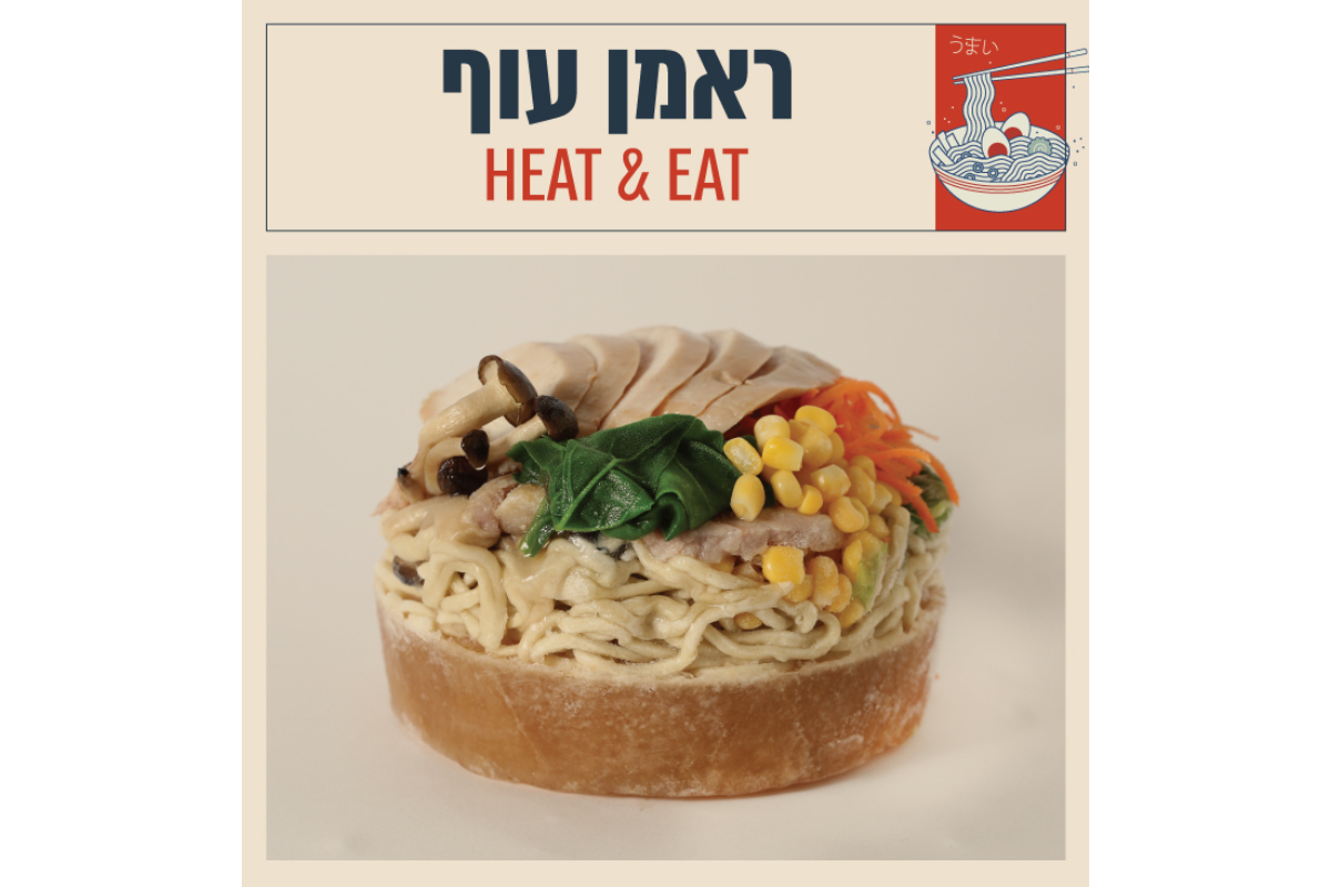 מרק ראמן עוף על בסיס ציר עוף ארומטי בתוספת אטריות עבודת יד, פרוסות חזה עוף צלוי, בצל ירוק, תרד, תירס מתוק, גזר, פטריות שי-מאג׳י וג׳ינג׳ר.