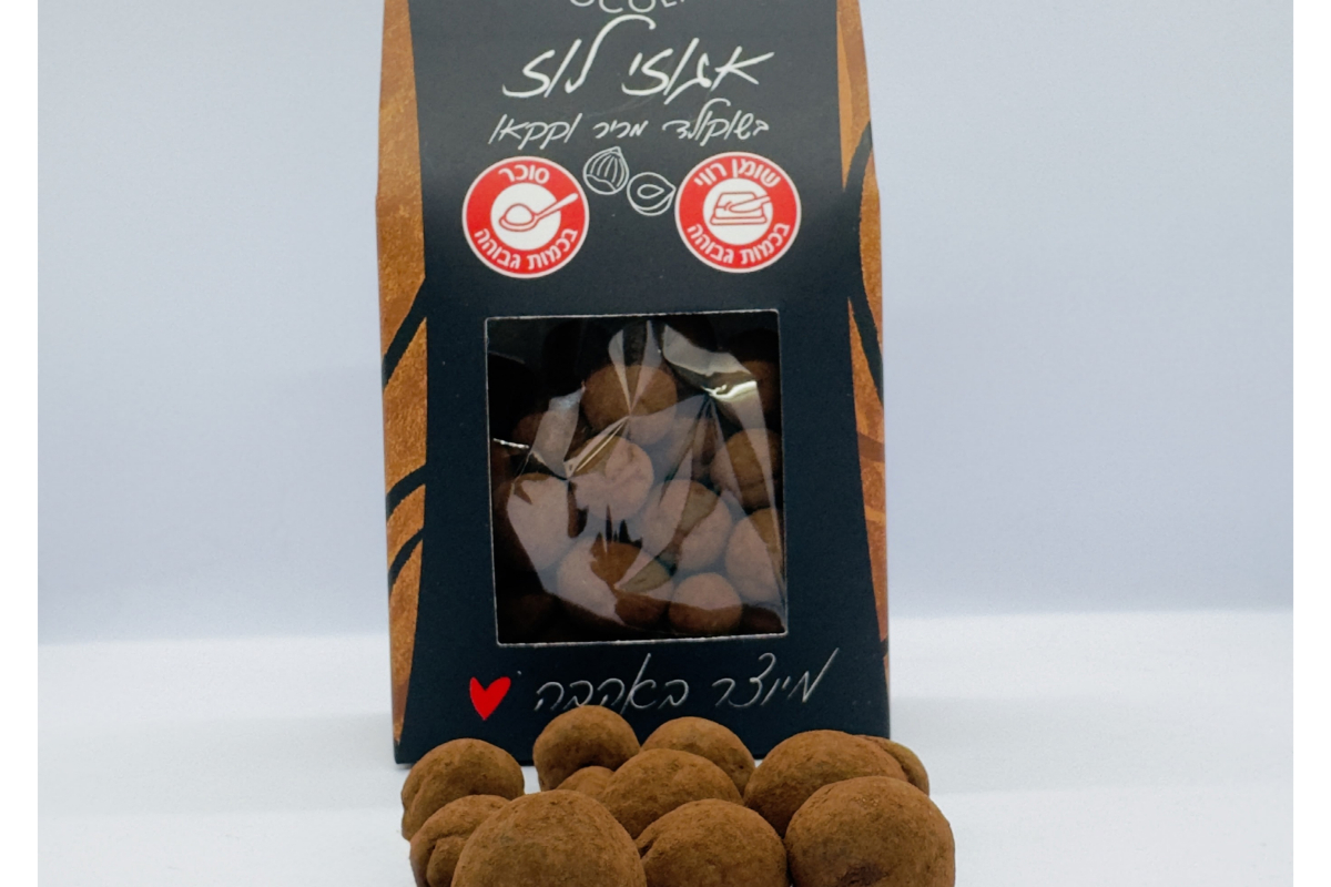 אגוזי לוז מצופים בשוקולד מריר וקקאו